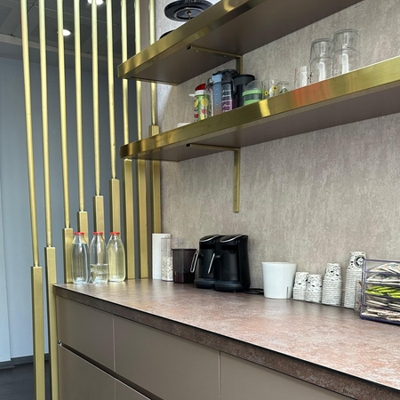 Üç Dört Beş Yayınları mutfak ve hol projesinde sirkülasyonun yoğun olduğu mekâna şık ve işlevsel bir tasarım hazırladık. Kullandığımız lüks aksesuarlarla, alana şık bir görünüm kazandırırken, aynı zamanda açık mutfak için fonksiyonel bir düzen sağladık. Modern çizgide yer alan aydınlatma, sehpalı puflar ve parlak detaylar ile alanı, keyifli bir serbest zaman mekanına dönüştürdük.