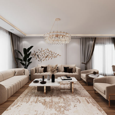 Bu projede modern çizgileri zamansız bir şıklıkla harmanlayarak sıcak, davetkar ve konforlu bir yaşam alanı oluşturmayı hedefledik. Yumuşak dokulu kumaşlar, doğal ahşap tonları ve zarif altın detaylar ile mekâna sofistike bir atmosfer kazandırıldı. Kristal avizelerle bütünleşen aydınlatma tasarımı ise ortamın genel ambiyansını destekleyerek görsel zenginliği artırdı. Koleksiyonumuzun bu özel parçası; estetik, işlevsellik ve konforu bir arada isteyenler için ilham verici bir yaşam deneyimi sunuyor.